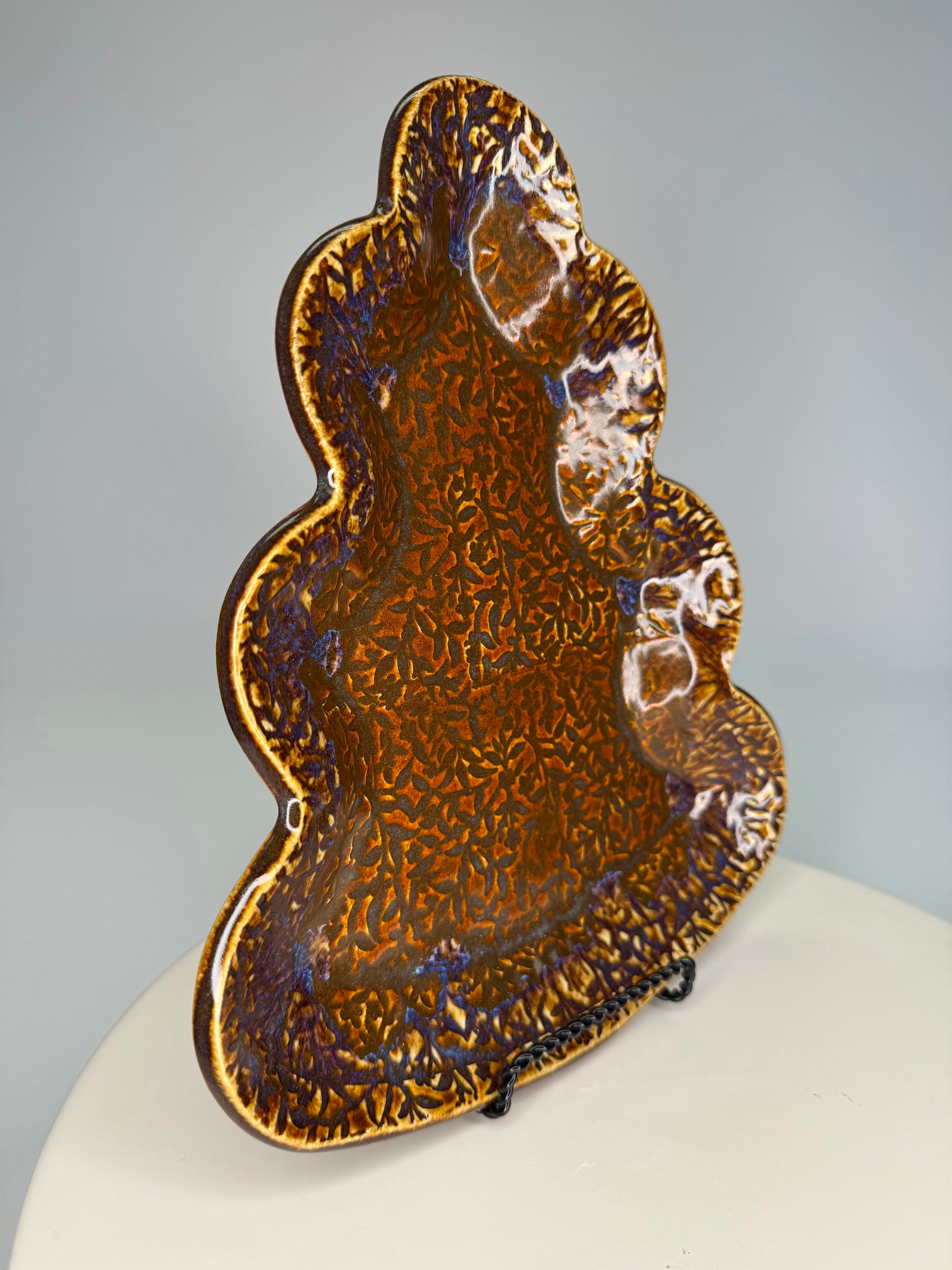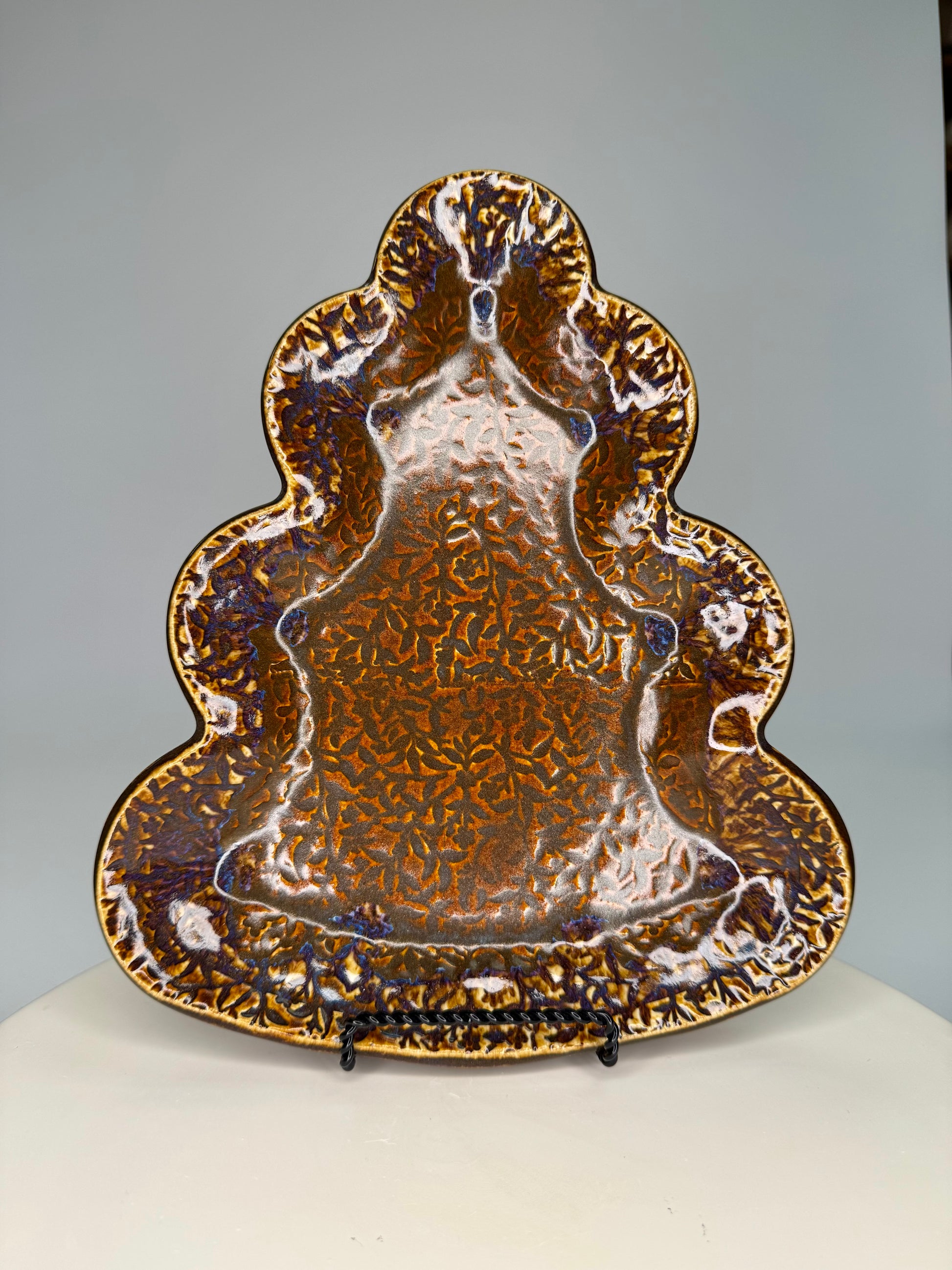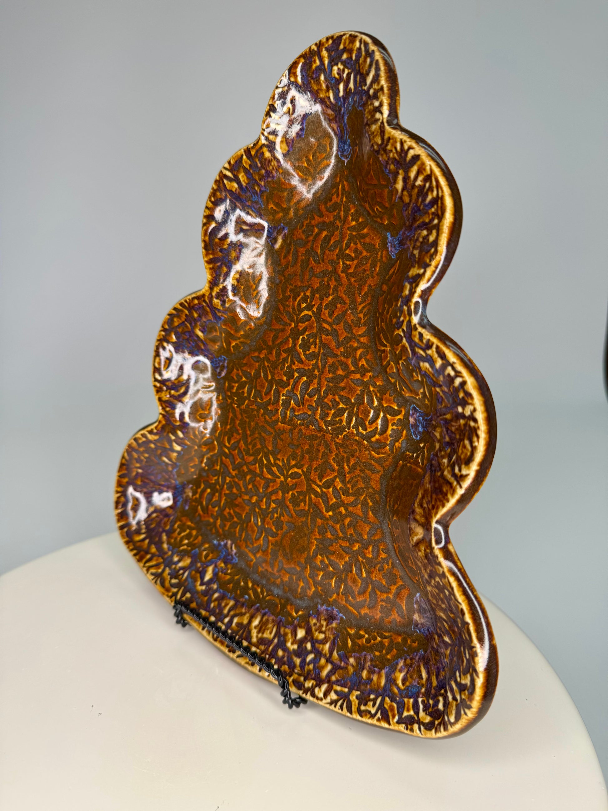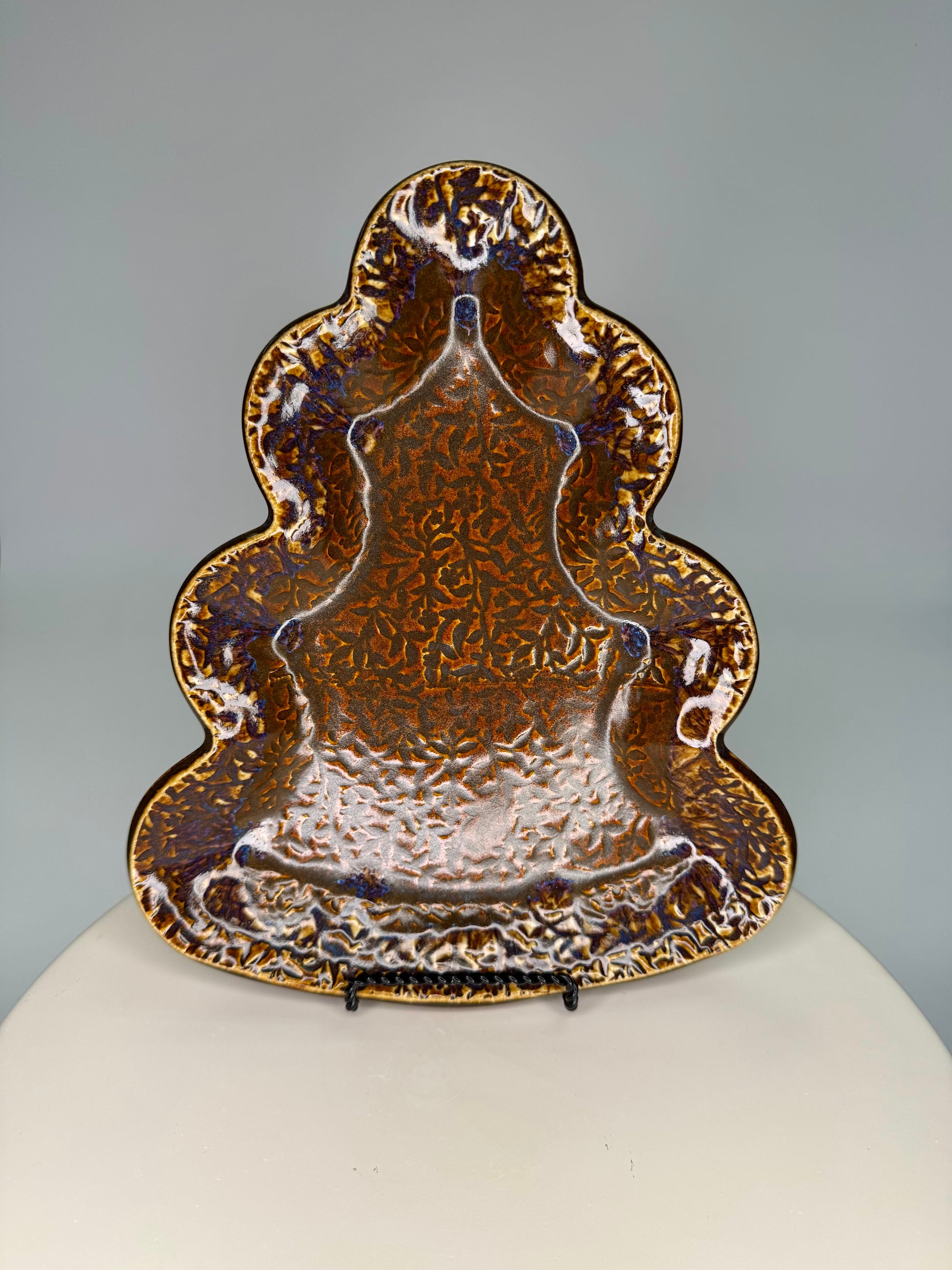 This beautiful Christmas Tree Platter features a glossy brown textured surface, perfect for the holidays! The longest point measures to approx 10 inches long.