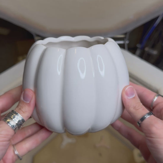 This harvest pumpkin planter is made from earthenware bisque ware, hand-glazed in a creamy white finish, and low-fired to 1830°F for a durable surface. Measuring approximately 5 ½" in diameter and 4 ⅜" high, it’s perfect for small plants or decorative use.