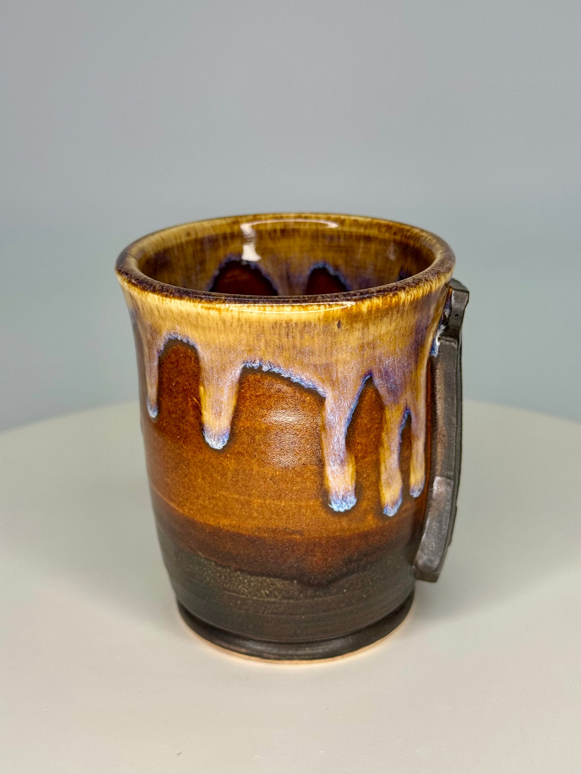 8 oz. A cozy, Green Dragon-inspired mug with a beautiful brown and amber drippy glaze combo. The perfect gift for the Tolkien lover in your life, or for yourself!