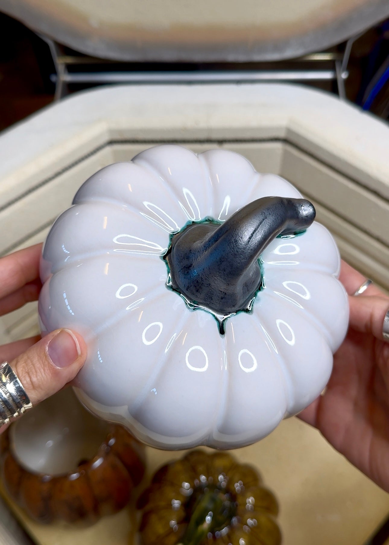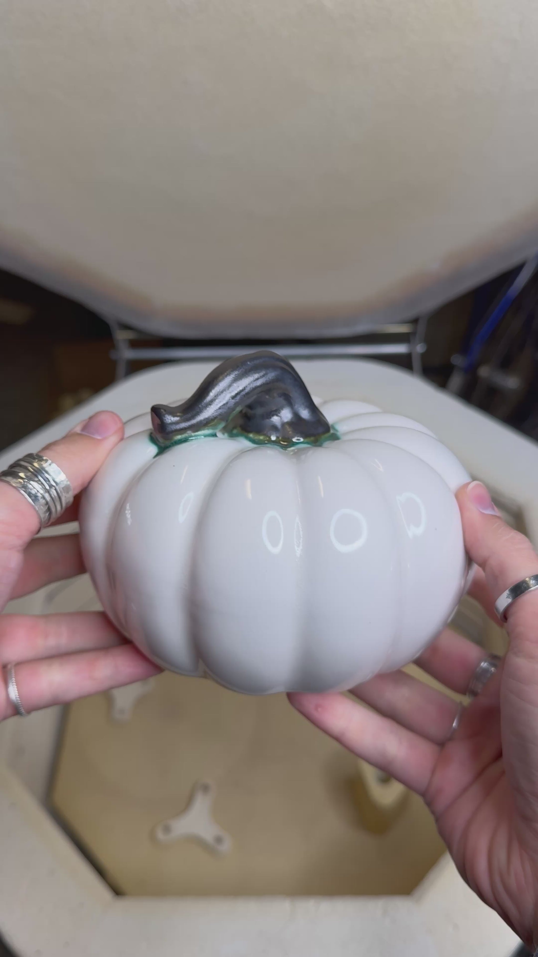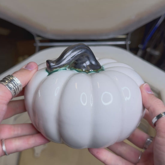 This decorative gourd is made from earthenware bisque ware, hand-glazed in a soft white finish with a matte gunmetal stem, and low-fired to 1830°F for a durable surface. Measuring approximately 4” high and 5 1/2" in diameter, it’s a charming accent for any fall display.
